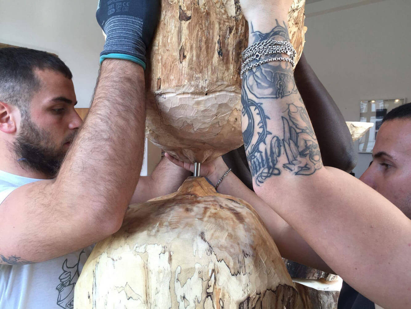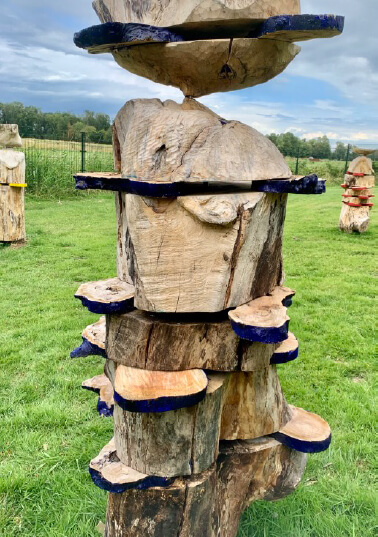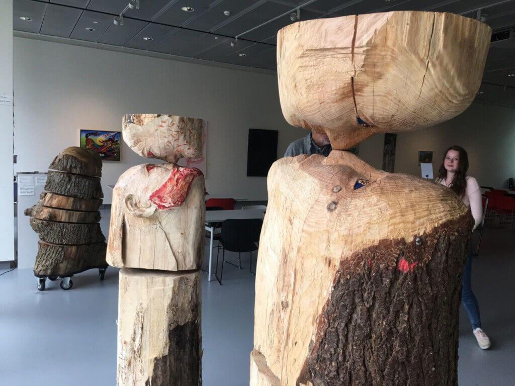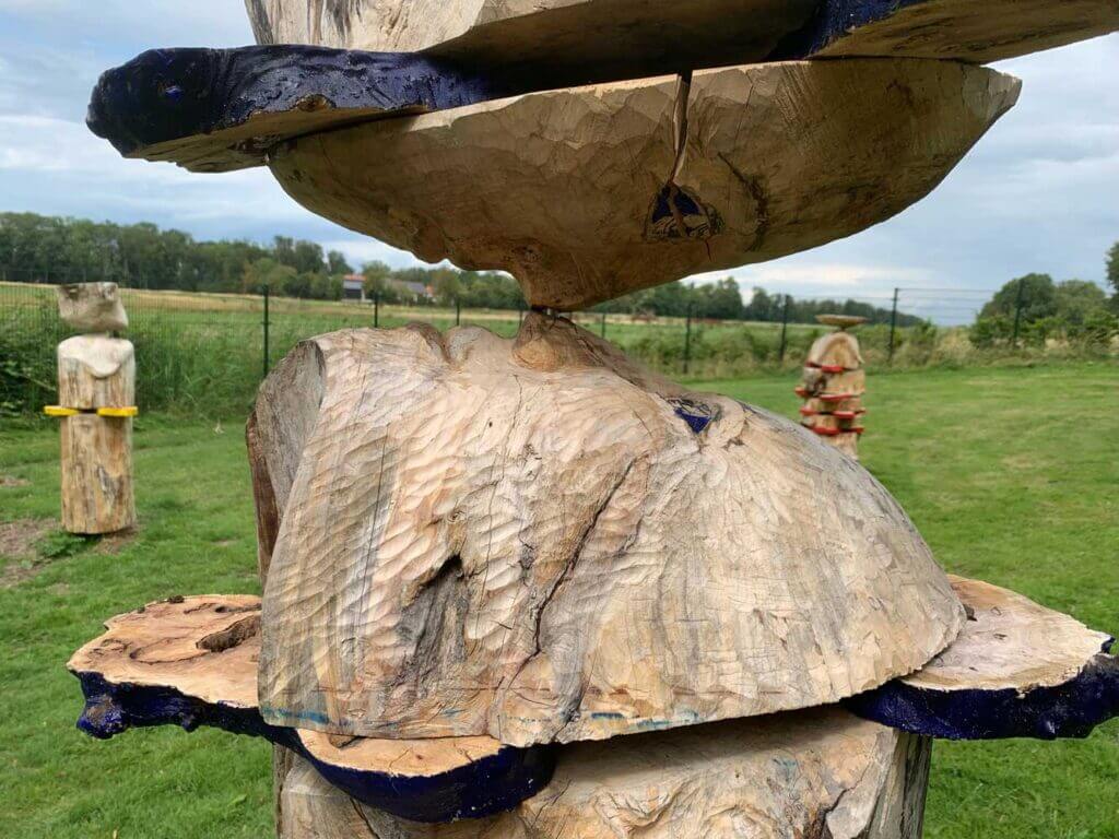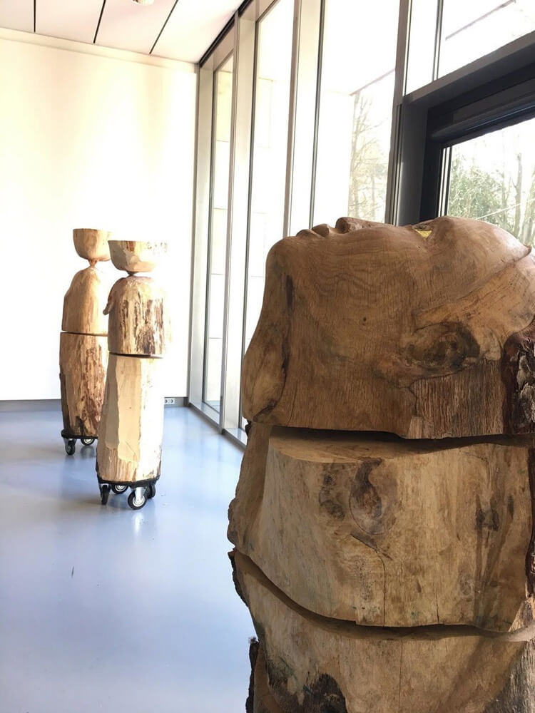 As a child I spent every Sunday wandering through the forest with my mother. On these journeys, I discovered many varieties of trees, some of which quickly captured my heart. I loved the solid, impressive beech trees. As I wandered along the hiking trails, their large eyes seemed to observe me. It was like being in a fairy tale. The trees came alive. they communicated with me. While only their outlines were visible, I could fees the cret world, to establish a connection between man and nature. These wooden sculptures express our human vulnerability: trees are the lungs of our existence.